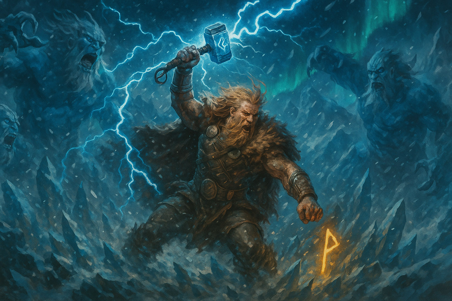 В северной традиции та же функция олицетворена в фигуре Тора – еще одного контр-мистичного и прагматичного бога. Он одновременно удерживает «анти-сознательных» турсов (фоморов как ледяных великанов, замораживающих различия) и противостоит Змею Хаоса Йормунганду. Его оружие — молот, сила чистой прикладной мощности, способной пересобрать границы и вернуть системе «рабочую» конфигурацию. Славянская пара — Перун и его конфронтация с Велесом — показывает то же взаимодействие сил: молниеносная, «полево-инженерная» стабилизация против текучей, проглатывающей силы подземных вод и мистических потенций.