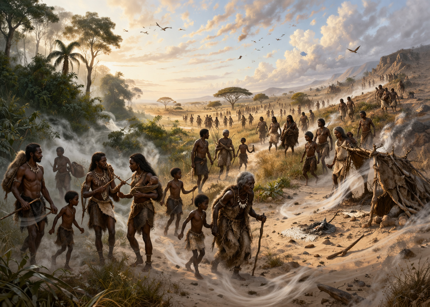 Их мир был постоянной чередой сезонных переходов и сверхдальних брачных смешений; это были племена, передающие свои навыки, предания, песни и гены на колоссальные расстояния. Своими странствиями Дети Воздуха связывали влажный тропический запад, саванны юга и восточные окраины Африки. Их материальная культура с изменением места обитания всякий раз исчезала бесследно, как и положено стихии воздуха. В сочетании с влажной и жаркой почвой Африки, не сохраняющей кости и другие останки, их кочевая сеть строилась и тут же растворялась, передавая потомкам исключительно инструменты выживания.