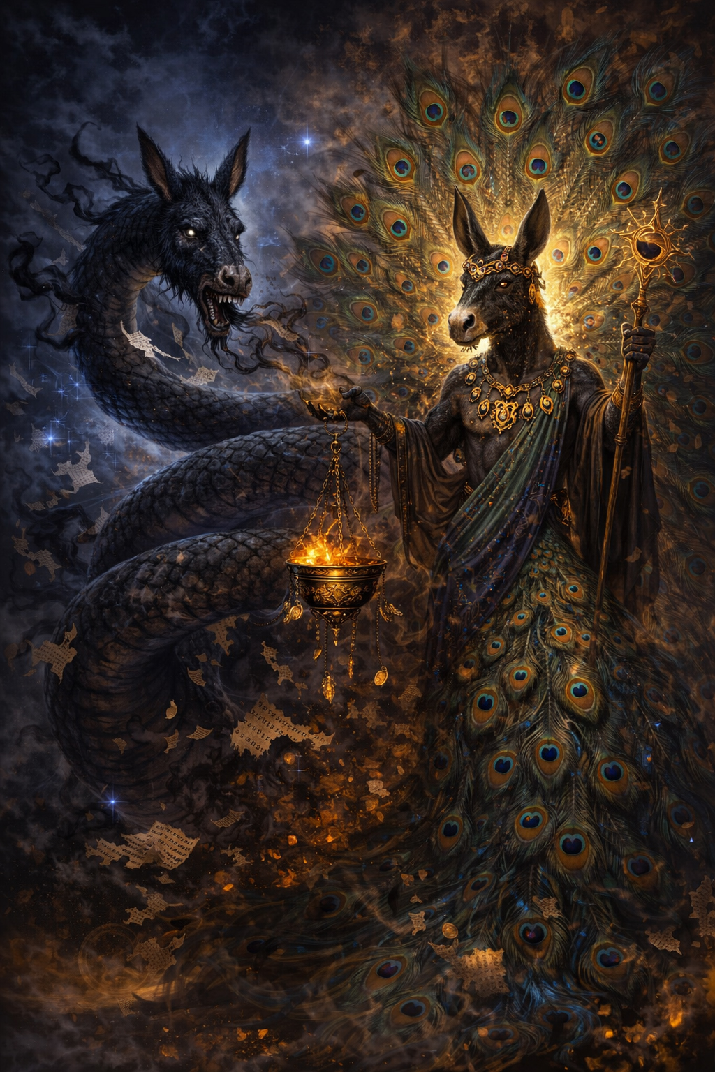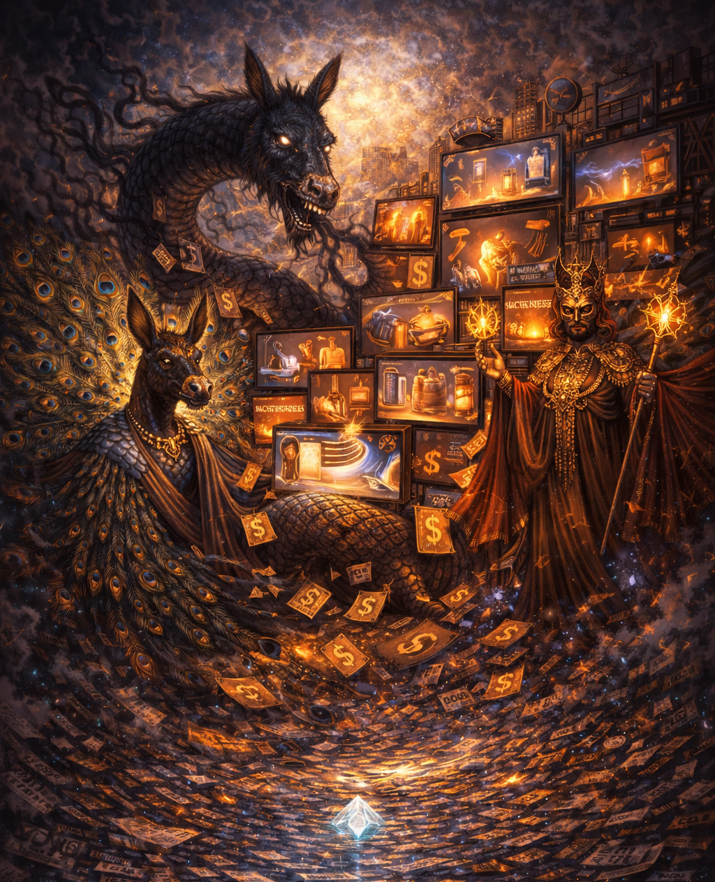 В рыночном аспекте Элоай реализует стратегию обесценивания через товарность. Информация превращается в ликвидный ресурс, ценность которого измеряется способностью вызвать заданный аффект. Здесь в игру и вступают Адрамелек и Паймон, превращающие данные в «Спектакль». Глянец и внешнее великолепие сообщения маскируют его внутреннюю пустоту. В этой «горизонтали» истина сама по себе не является рентабельной, а потому она надежно утоплена в океане семантического шума и «бесполезных фактов».