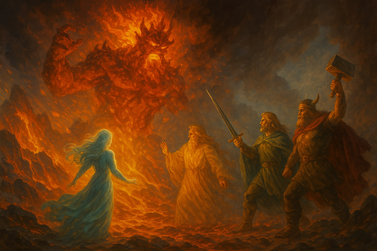 Первое схождение альвов было связано с Огненными активностями, превращая планету из хаотического сгустка вещества — в пластичную, динамичную сферу оплотняющейся материи. При этом сразу после схождения альвов начинаются и нападения хаотических сил огня — сверхвулканизм, метеоритные удары, кипение недр формирующейся планеты. Поэтому далее в борьбу вступают ваны, и, как утверждают предания, Фрейр — один из их вождей — обуздывает огонь и превращает его в процесс окисления, необходимый для жизни. Это соотносится с геохимическим зарождением кислорода и ранних аэробных механизмов. Ну и силы порядка – асы – встают на защиту формирующегося космоса, противостоя окружающим его энтропийным влияниям.