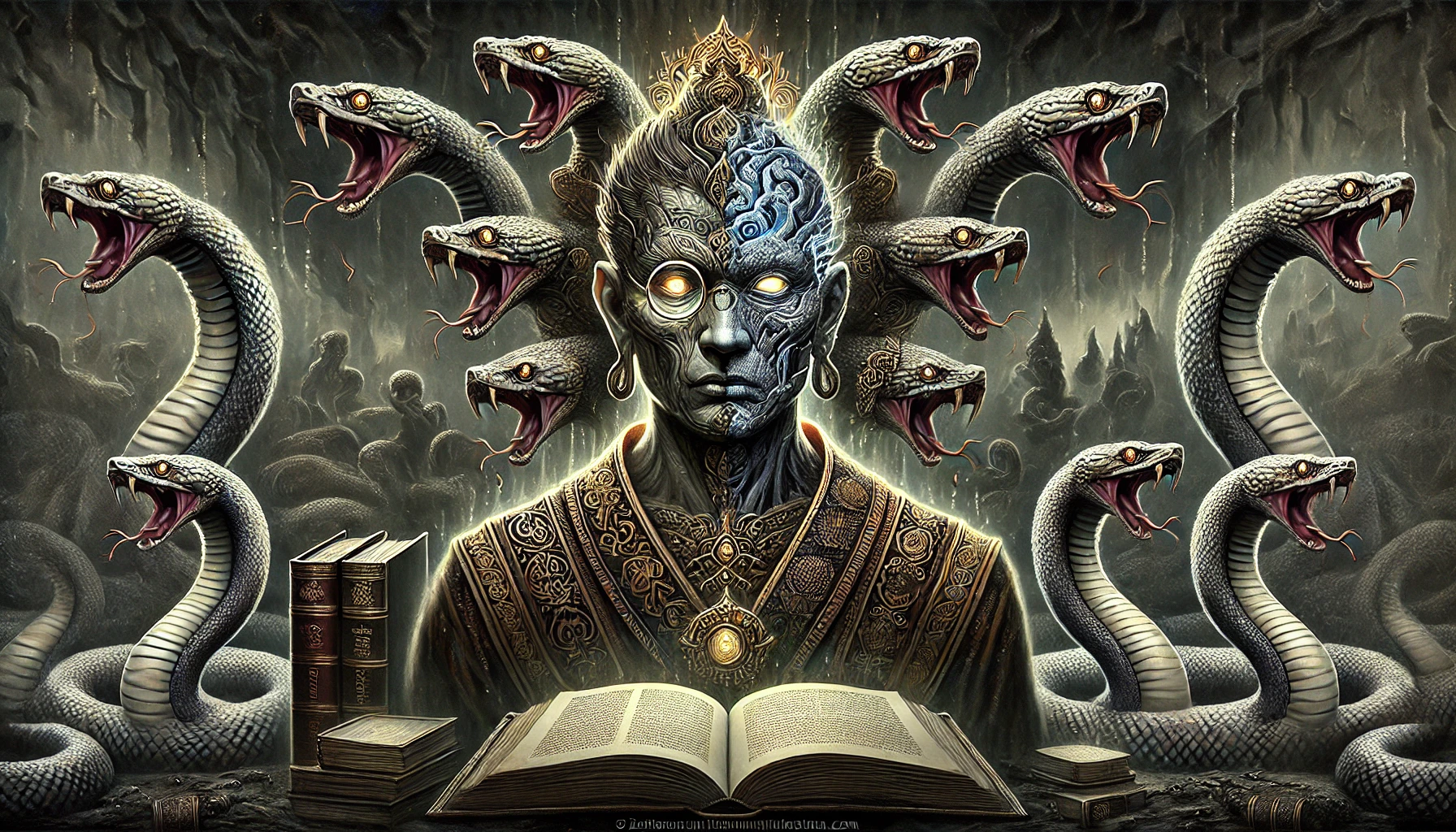 Мы уже обсуждали, что в буддистской традиции наги – это двойственные существа, которые могут быть как хранителями знания, так и олицетворением омрачений (клеша), препятствующих пробуждению. Их змеиная природа связывает их с неведением, привязанностью и инстинктивными силами, которые удерживают сознание в круговороте сансары. В этом смысле наги олицетворяют знание без мудрости, интеллект без духовного прозрения. Это подчеркивает важное представление о том, что знание само по себе не ведёт к просветлению, если ум остается омрачённым.