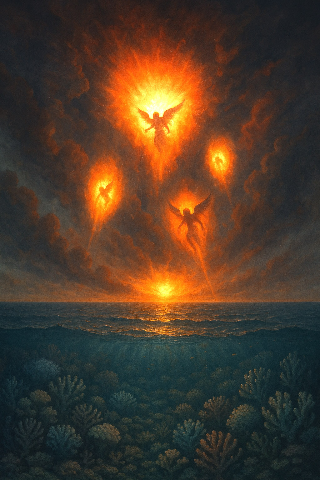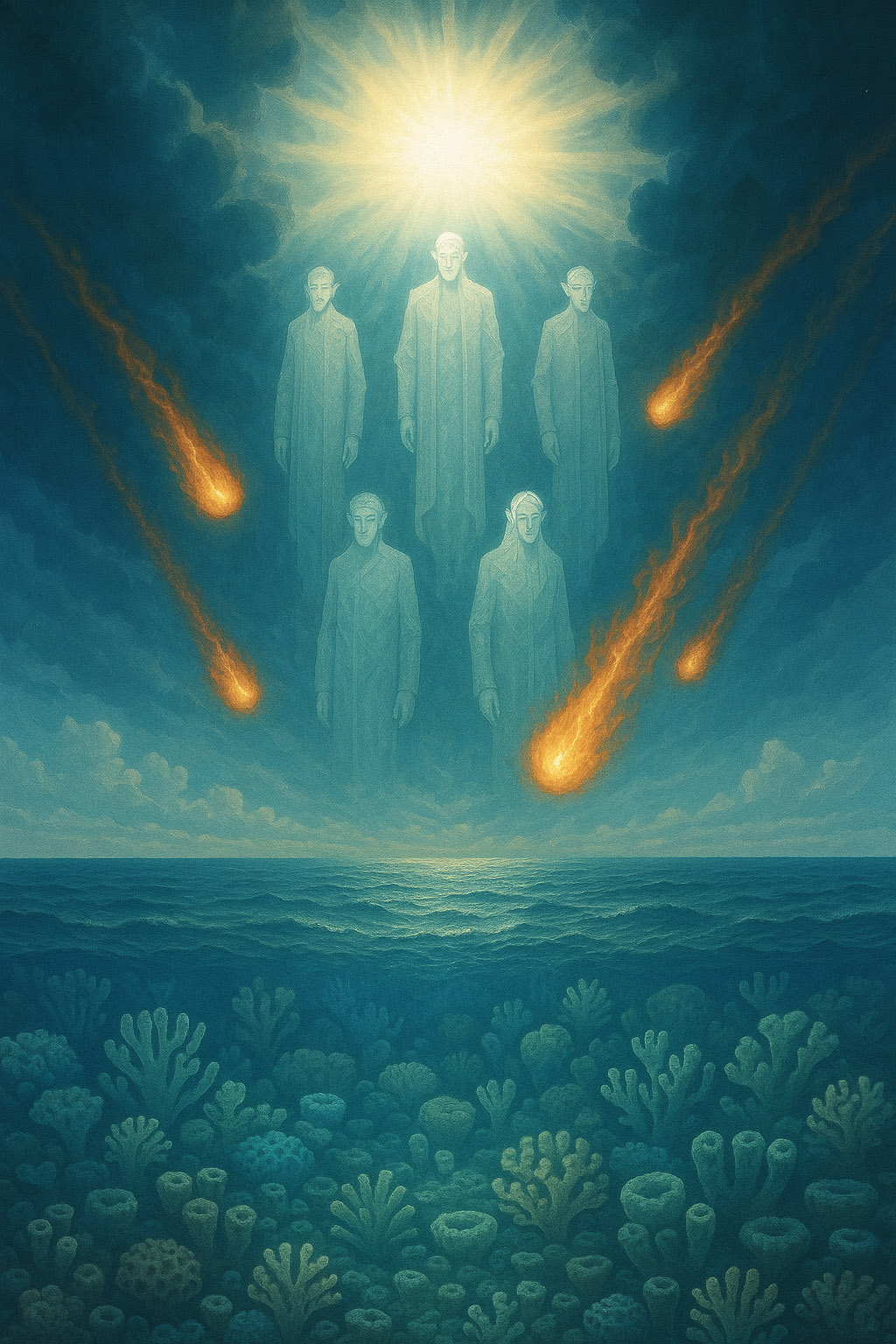 Мы уже обсуждали, что, согласно многим мифам и хроникам, на заре существования Земли, еще примерно 440 млн лет назад, произошло очень важное событие, изменившее весь ход дальнейшей эволюции жизни на планете, и сильно отличающее Землю от большинства других проявленных миров — Сошествие Григори. Согласно «Хроникам фейри», это событие имело место в конце Первой эпохи – эпохи Кесайр – и поначалу было почти незаметным именно на фоне катастрофы окончания этой эпохи, известной палеонтологам как «Ордовикско-силурийское вымирание». И одна из причин этого вымирания, которую связывают со вспышкой сверхновой и γ-лучевым ударом по Земле, и рассматривается с мифоисторической точки зрения как описание того огромного высвобождения энергии, которое и имело место при конденсации серафимических вихрей – в тела григори. Их схождение сопровождалось зрелищным небесным явлением — ярким заревом Архонтов, знаменующим конец Первой эпохи и начало нового цикла, и огненными шарами, отражающими само воплощение григори. Появление григори как огненных «полувоплощённых» сущностей в это время соотносится с гибелью прежних морских форм жизни, массовым вымиранием водных организмов.