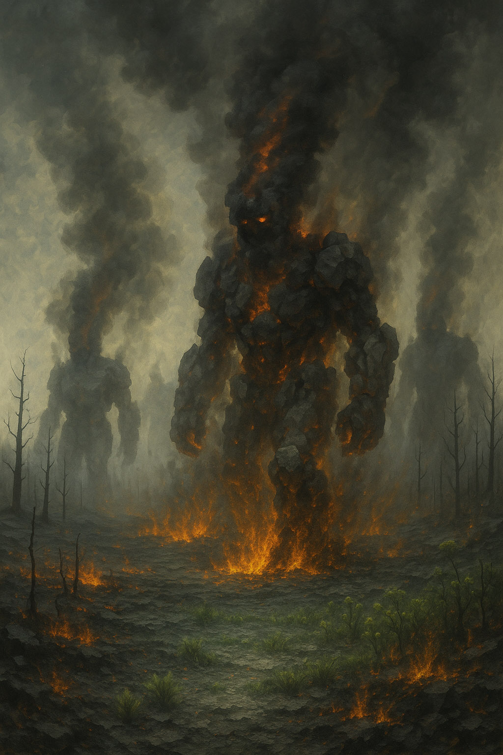 Однако параллельно с этим происходил и процесс оформления тел григори, их «адаптация» к условиям физического мира. Самые сильные из них сразу сумели создать для себя плотные тела, окутанные густым серым дымом, явившимся формой конденсации их Первичного огня, и воплотившись полностью. Те же из григори, кто был «меньше» или «слабее», оказались неспособными к самостоятельному оформленному проявлению. И тогда старшие григори начали создавать для них оболочки, грубые тела из камней и минералов Земли, в которых лишь едва теплилось проявленное сознание. Так на свет появились первые фоморы — бергрисары, существа, частично воплощённые, с телами из грубого материала, словно големы, горящие изнутри жаром огненного духа — шеруф. Они двигались по планете как ожившие пылающие колонны, оставляя после себя лишь выжженную землю и пепел. И едва только новые ростки, так заботливо вызываемые дриадами, появлялись над поверхностью, бергрисары своей тяжестью и огнём обращали их в пепел. Этот пепел, словно густой серый снег, оседал над материками и океанами, укрывая Землю слоем выгоревшей пыли.