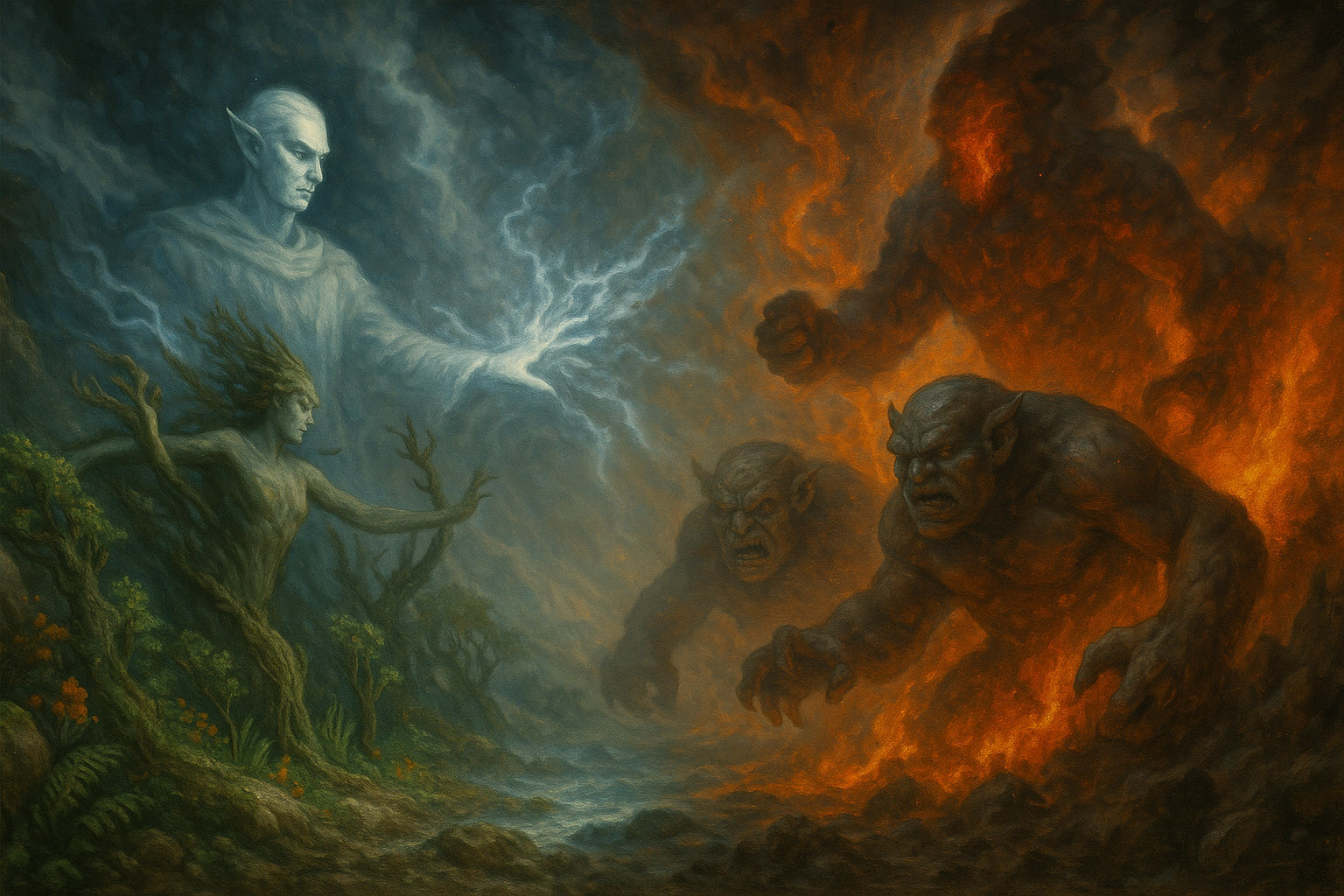 Неизбежно возникшее при этом столкновение альвов и фоморов получило в памяти человечества название Битвы при Маг Ита, хотя оно было не отдельным сражением, а длительным и повсеместным противостоянием сил порядка и хаоса, созидания и разрушения, льда и огня, роста и искажения. Эта «битва» шла миллионами лет в глубинах почвы, в воздушных токах, в рассеянном пепле. Бергрисары давили, фоморы выжигали, альвы и ваны восстанавливали, и каждое растение, каждый гриб, каждая водоросль становились ареной и субъектом противостояния.