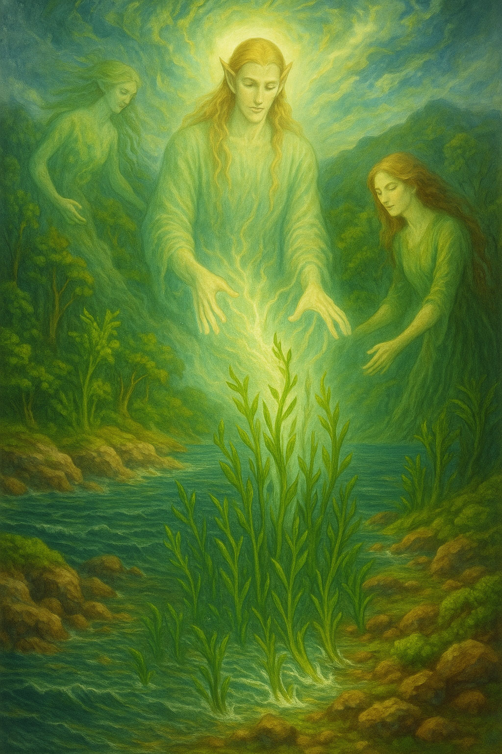 Так и разыгралось первичное столкновение энергетических начал реальности: с одной стороны выступали альвы и духи растительности, объединённые энергиями структуры и роста, а с другой — фоморы, существа огня, врывающиеся в проявленный мир, которым не было дела до жизни и гармонии. При этом альвы впервые деятельно поучаствовали в этическом выборе, в действии, в истории, и с этого момента история Земли становится еще и драмой сознания.